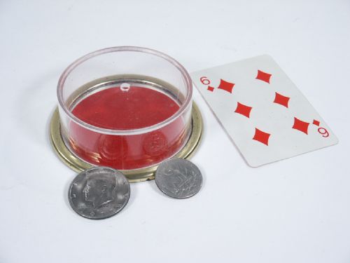 A half dollar and quarter are shown and half dollar placed on tray and covered with clear Lucite cover. The quarter is placed on top and covered with a card (supplied) and a gently push causes the quarter to penetrate and join the half! Card is removed to show this has indeed happened. Includes instructions. Condition very fine.