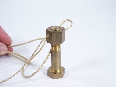 A large brass nut is threaded onto a matching bolt and a cord is threaded through a hole drilled through the bolt and the nut. With both ends of cord securely held and a handkerchief placed over the nut and bolt the spectator himself reaches under the handkerchief and like lightning the bolt is free from the nut. The cord nut and bolt may be examined! Includes instructions. Condition very fine.