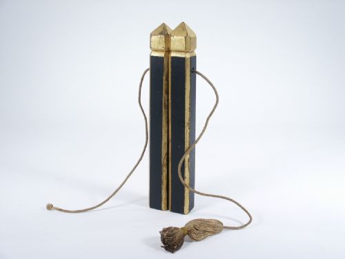 Pillars are made of wood and are 8 7/8" in length and together have a cord running through the openings near the end of the pillars. A knife (not included) may be used to slice through between the pillars cutting the cord yet when placed back together the cord is drawn back and forth. I have never seen such a hidden and hinged opening trap in any like this before. An early set. Condition good.