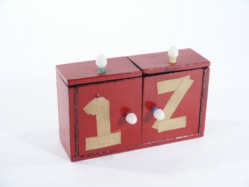 Made of wood with metal piano hinges and measures 5 1/2" wide x 3 1/4" high x 1 5/8" deep. This has a double door feature for peek prior to vanish on left side and the shell is of metal as shown on the right side. Maker unknown. Numbers on front doors are of tape and overall good condition.