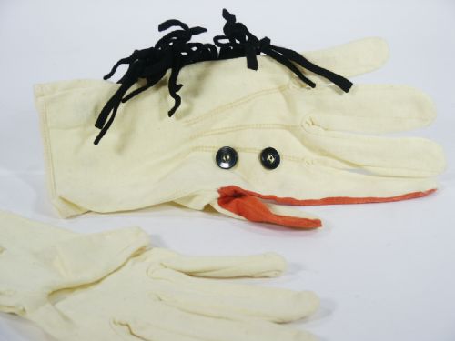 It seems like I have seen this somewhere before... This glove puppet includes the right hand plain glove and this will give you a chance to be a hit with the kids, practice the ventriloquism or turn your head completely away when the hand speaks. Condition fine.