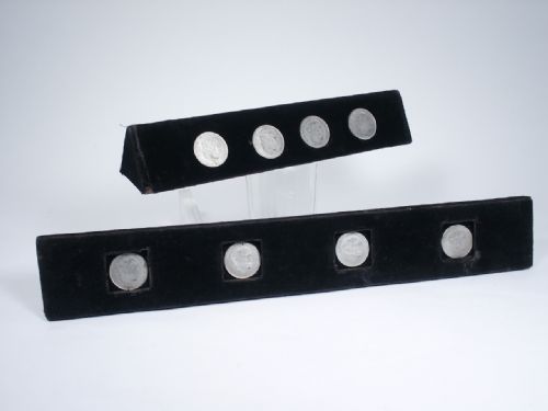 European. What you have is an easel 10 7/8" long on the triangle end shape with 4 T. Nelson Downs Coins on one side and rotating the easel 1/3 turn shows a ledge for which coins may rest. The second piece is 16 3/4" long having an internal slide mechanism which by moving a projection at rear brings about the appearance or vanish of the 4 Downs coins. All are made of metal and covered with black silk velvet. Condition early and good.