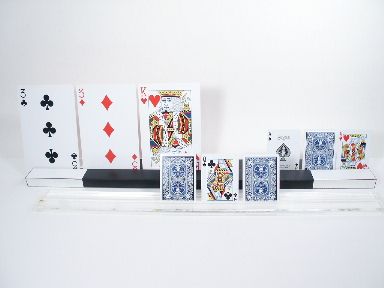There are times in the performance of magic you will need a display stand for either jumbo cards or regular cards to help with the visuals on an effect you are performing. Here are 2 displays both made rather nice. The first is laminate over wood measuring 26 inches long x 3 inches deep x 3/4 inches high which will accommodate up to six jumbo cards across and ten poker size cards as well. The second display is of Lucite measuring 23 1/4 inches long x 2 inches deep x 1/2 inch high with the slot to accommodate cards cut at an angle to give a slight tilt to the cards displayed. Cards not supplied. | |