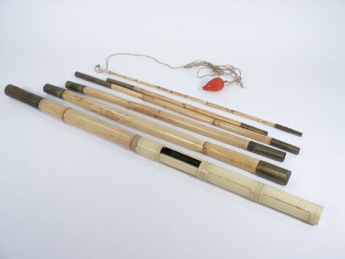 This is a bamboo fit together fishing pole with the special metal crafted handle which gives access to three different chambers for stealing a fish. This also includes the bait for causing the appearance of a fish. You seldom see one of these units. Condition fine.