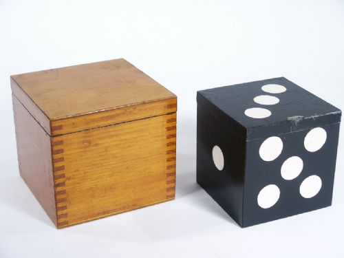 A handsome wooden chest measuring 4 1/4" high x 4 3/4" wide x 4 3/4" deep is shown along with a die made of wood. The die is placed within and lid closed. When opening the lid again it is seen that the die has completely vanished and in its place may be anything the chest can contain! Not often do you see one of these units. Condition fine.