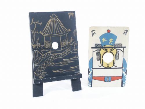 This is entirely made of metal including the cards. It stands in a metal easel 9" high with a width of a little over 5 1/2" at the bottom legs. A metal card depicting an Asian with open mouth is shown that measures 7 1/4" x 4 5/8" and laid aside. At this point a solid object (not supplied) with a diameter of 3/4" is inserted into the opening at center of frame. The card is taken and inserted into the frame slowly pushed down until it is completely in. At this point the frame is taken away from the easel with the solid object still in place and the frame is pulled apart which shows a division horizontal at the half way point that now shows the solid metal card having penetrated the solid object! Many years ago an American version made use of a clear plastic tube that a silk could be pushed through as well to use for the penetration. Includes instructions for the early American version which comprise of 2 pages. Condition minor paint absence overall but certainly a well made and durable piece since metal is used throughout. This is one I have never seen before.