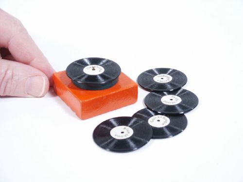 Five small records with different tiles are shown to the audience, backside up. A spectator is asked to pick a record and after placing it on a special record player, the magician can tell which melody is on the record. The audience may now examine all without a clue as to how it works. This charming piece of micro magic is really nice in that the records themselves even have cut lines mimicking a record! The player is made of wood having a felt top upon which the record is placed on the spindle label side down. The records are 1 3/8" in size. Includes instructions and one you can do. Condition First Rate.