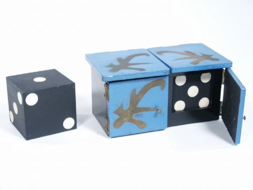 Box measures 6 1/4" wide x 3 1/8" high x 3 1/4" deep having brass hinges that are held with screws. Has sucker sound mechanism built in and die measures 2 1/2", well made of wood both die and shell. Condition very good.