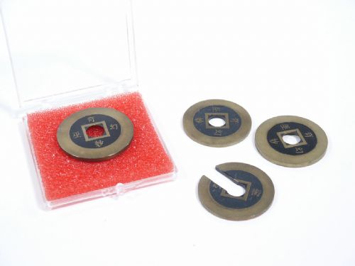Includes 3 precision machined realistic Chinese coins as included with the original effect and the addition of another slightly larger shell coin that will nest over the others. You will need to furnish a velvet rope or cord. A bewitching triple penetration that makes the magician look like a professional sleight of hand performer although no special sleights are required. Includes 3 pages of instructions. Condition fine.