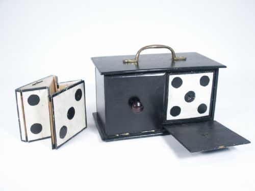 This is a very scarce item for the Collector and especially one sought by Die Box Enthusiasts. Made of wood and measures 9 3/8" wide x 6 1/2" high to the top of brass handle. Die is 4". Also included is a sound mechanism.