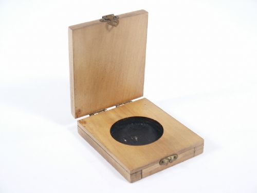 This wood case measures 2 5/8" x 2 1/4" and 5/8" thick having a round receptacle in which items may be placed such as an English Penny, Colored Discs of paper or other such similar items and lid closed and latched. Holding the case for just a moment and shaking near the performers ear, just to make sure an item has been placed within, the performer will be able to correctly divine the contents color or the heads or tails position of the English Penny (not supplied). Includes illustrated instructions. Condition fine.