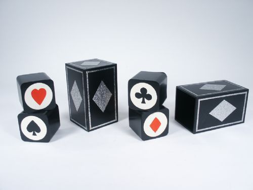 Well made of wood and as two wood covers which stand 5 1/4" high each having two blocks respectively with two different card pips. There are magnet attracted panels that slip off or stay on to show one pip or a different one and both covers are gimmicked to attract the panels. Includes Dutch language instructions that are well illustrated so you may discover the actual workings. Condition very fine.