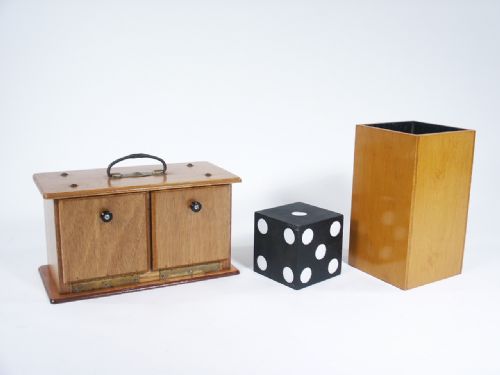 A classic style Die Box and Chimney from Davenport's in Great Britain. Made of wood with brass hardware. The Die Box measures 8 7/8" wide x 4 1/2" deep x 4 5/8" high having two doors in front and two doors in back all of which are hinged at bottom edge to open down for a clear view through the box and has a great sliding sound mechanism. The Chimney measures 7 1/8" high x 4" square and constructed along with Die for vanish of the Die placed within. This may be used with the Die Box if desired or not but is furnished as the Deluxe Outfit from Davenports. Also included is the solid ungimmicked die along with 2 five sided shells each having a hinged flap that opens out which works with the styling operation of the box and chimney. Includes instructions for operation of chimney. Condition: the Die Box has a tiny nick on the top end side, otherwise very fine. Chimney is very fine. The 2 shells which have hinged flaps are coming away due to age and hinges are of cloth and can be replaced if desired. The entire unit is very well made and one that is seldom seen.
