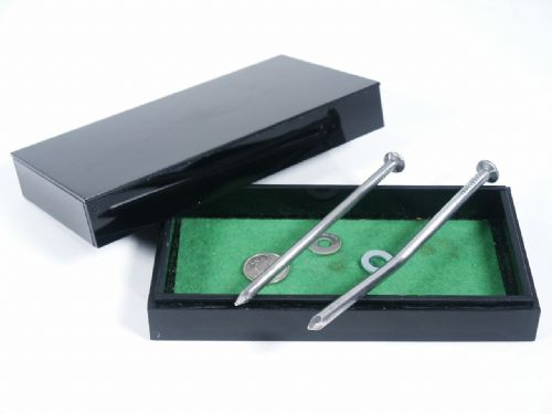 Circa 1985. Opening a box the magician shows a nail and a washer showing that there is no magnetic attraction between the two. Taking the nail between his hand he rubs it giving it the power which is now used to pick up the washer with the point of the nail! The spectator is handed the nail along with washer but is unable to get the same results as the washer will not adhere to the nail!