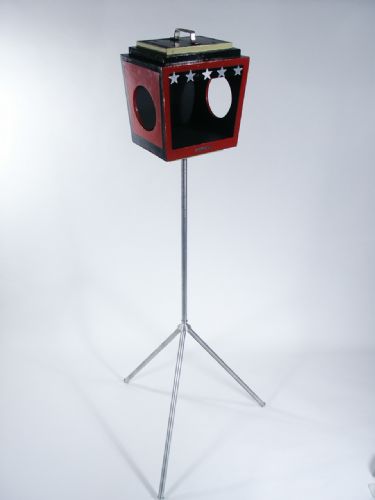 This stands 47" high with the cabinet itself measuring 8 3/4" wide x 7 1/4" deep x 10 1/4" high to the top of the handle. Loading of bird is easy and has a safe lock feature which prevents bird from opening chamber. The support down tube with three legs is impressive quality made from spun metal as one would come to expect from a European item. This item breaks down to the three legs, down tube and cabinet. Condition very fine.