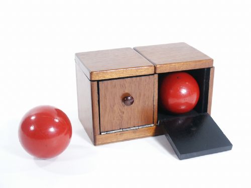 Made of solid wood, measuring 7 3/4" wide x 4 1/2" high x 4 1/2" deep and vintage having piano hinges for the doors. This is one you've not likely ever seen before as it makes use of solid 3" wood ball. Within you will find metal flaps that give access to a bottom opening on one side and on the other you will find what appears to be a metal fitting that extends at the back side which apparently was used in conjunction with a red balloon which has long since become brittle and gone away. So with these things in mind you can begin your discovery into what someone would routine with the appearance or vanish using a red balloon simulating the red ball. Includes 2 red balls. Condition good.