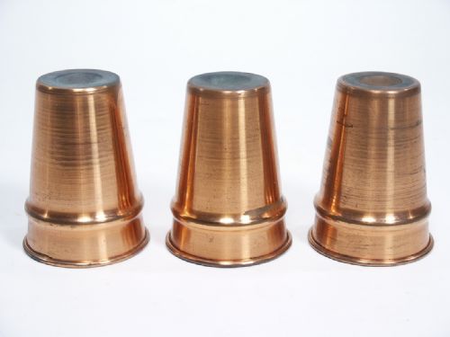 This lovely set of copper cups were found wrapped in paper from the time they were purchased and have the appropriate dark patina which may be polished off if desired. They measure 3 5/16" high with a mouth diameter of 1 1/4" and a shoulder height of 1". The sponge balls are hard and brittle but will be included. These were never used and have no dents whatsoever. Includes instructions for Loftus De Luxe Cups And Balls. A find for the Collector.