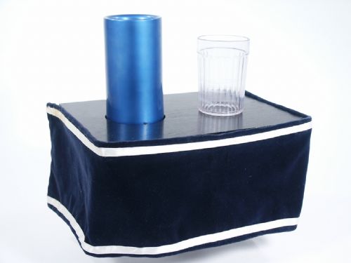A simple tray with drape that measures 11" x 8" with wood top is shown with a glass and a metal cover. The magician covers the glass and has it vanish but the drape falls away showing what really happened to the glass. The magician tries to explain and in doing so the audience is fooled as the glass vanishes without the first shown method. Condition very fine.