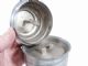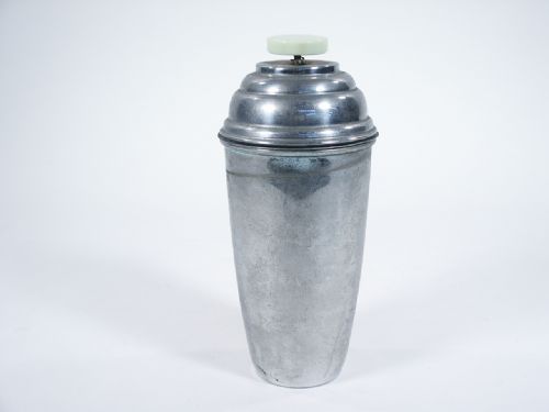 This metal Cocktail Shaker is 8 1/2" high with a mouth diameter of 3 3/4". This is fitted with a top that has a T-bar activated by knob on top that engages with shallow lid having two bent right angle metal tabs that allows for removal of such from body of vase. The vase has a very solidified due to age rubber interior lining. Overall condition metal with light pitting/tarnish, otherwise fine.