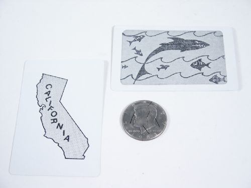 A half dollar representing earth is placed on table or in spectator's hand. After showing California and Pacific Ocean illustrated on two playing cards the spectator plays the role of mother nature and causes an earthquake! So powerful is the quake that it destroys the entire planet and the half is now in pieces. It continues on with topical patter. You will need your own expanded half to complete that is not included. Includes instructions. Condition very fine.