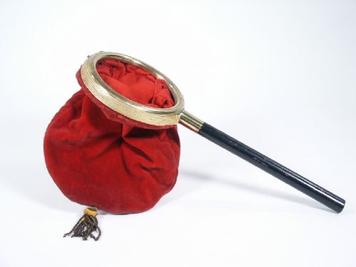 Rim is 4 3/4" in diameter with Red Velvet Bag and Bullion Fringe Tassel having wood handle. Condition well used, brass collar on wood handle has come away from solder to rim and wood handle has been shortened but still has life left in it.