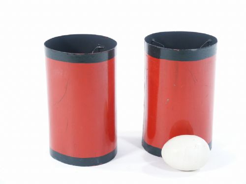 A very long time ago a gentleman I knew by the name of Alan Cracknell told me of this effect and how crazy it was and at that time I said that I hoped to see one some day. Well, here it is for your curiosity as well. You will need your own eggs and of course a piece of toast to place between the two cylinders in a stacked position. The cylinders are of metal and stand 5 1/8" high with a diameter of 3 1/4". I hope you have fun! Condition good.