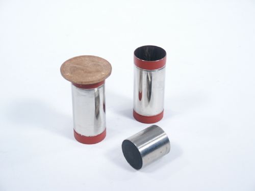 Two metal tubes each 1 7/8" in length are shown hollow and an English Penny is placed between the two stacked. A solid metal and wood bar is shown and dropped into the top tube and it passes through the coin and out the bottom of the lower tube! To find one of these today is not an easy task especially in complete condition. Includes instructions. Condition fine.