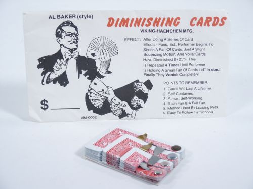 After doing a series of Card Effects, Fans, etc., Performer begins to shrink a fan of cards. Just a slight squeezing motion and Voila! Cards have diminished by 25%. This is repeated 4 times until Performer is holding a small fan of cards 1/4" in size! Finally they vanish completely! Includes instructions. Early Viking Haenchen. Condition like new, never used.