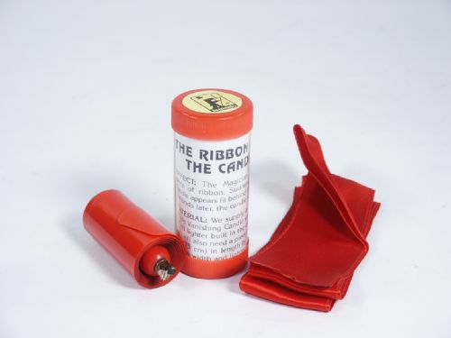 The magician shows a piece of ribbon. Suddenly a tall candle appears lit behind the ribbon! Seconds later, the candle vanishes. Includes instructions. Condition very fine.
