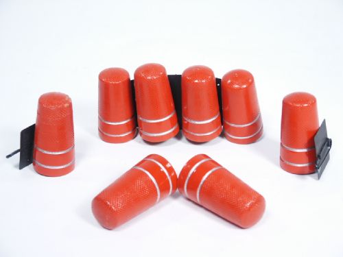 Thimbles are of wood and are 2" in length making for a very visible display during the routine. You have 8 thimbles in all with 1 holder that is pinback which holds 4 and 2 separate pinback holders that each hold 1 thimble. A really nice set. Condition one thimble has minor paint absence near tip others are all very fine.