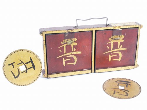 After a Chinese Coin measuring 3 3/16" in diameter is shown and placed in a four door cabinet it is made to disappear with much back and forth with audience as to how. Finally all four doors are opened and a spectator that has been brought on to help is turned around and on their back is found the missing coin. This is actually a charming early piece and the funny that is that the performing magician had a label affixed to the top stating Front. This end to the right. You gotta love these subtle cues. Condition good used.