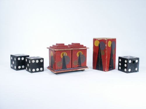 A style of which you are not likely to have ever seen before and this one with a die of 2 13/16" in size. What you have is a solid die of wood along with a five sided metal shell with hinged flap that lays down with open door to show vanish. The die box has a sounding mechanism and made of wood with brass hardware and brass ball feet and measures 7 3/4" wide x 6" high x 4 3/8" deep. Also included is a Chimney Vanish along with a five sided metal shell die with a hinged flap for showing vanish in chimney. One of five side shells also has finger hole to hold solid die within until the proper moment to drop out into whatever receptacle is used. Chimney is 7 1/8" high and is 3 3/4" in size. This is a very old unit and has appropriate age wear but still lots of character for the Collector of never seen before items.