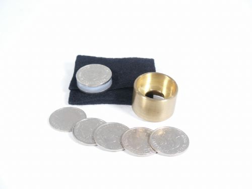 What you have is a solid brass cylinder that has a division half way that is horizontal and has an opening so that coins may be seen when placed on either side. A gimmick which is 2 Krones with Lucite in-between and 5 Krones are included for what is assumed the purpose of passing the coins through the dividing portion of the cylinder and the table upon which it rests. It will be up to you for translation of the instructions but the props are really well made and includes cloth carry bag.
