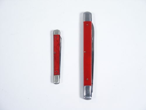 Early style with silver bolsters, what you have is one red/white knife in regular size and one black/red knife that measures 5 1/8" in length. Condition very fine.