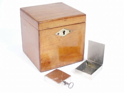 The wood chest is absent a key. The silver boxes are in very fine shape and work very well having the original key. Sold in as is condition.
