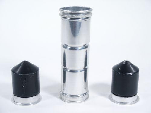 Made of metal and 6 1/2" in length with 2" diameter. You may pass this tube for examination prior to using rings and tissue paper to cap the ends closed. What happens next is a production of silk, streamers or what have you (not included) which can be quite impressive to the ones that just examined the tube! Includes instructions. Condition very good.