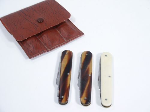 This handsome set of knives was put out by Harry Stanley and of Ken Brooke routining which includes 6 pages of illustrated instructions and considered a Magi-Tutor. The knifes are of Stainless Steel blades and by Sheffield of England. Along with the carry case you receive one all white knife, one tortoise color knife and one with white/tortoise for this quality Ken Brooke routine. Condition one knife has scoring on one end at the darkest end of tortoise color that was likely done by the previous owner to know which knife by feel. It is not obvious since it is such a dark end. Otherwise all in very fine condition. This is not a set you are likely to see.
