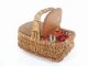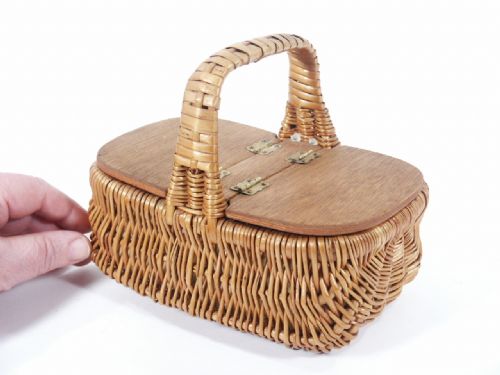 This basket stands 6" high with basket dimensions of 7" x 4 3/4" x 3" having a wood top like a picnic basket which is hinged to open up on either side of handle. This has been fashioned in such a way that you can look in and feel you are seeing the entire basket as the gimmick is that good, as you can see in the picture. This is a really nice basket and I am concerned that Pamela is admiring it a bit too much! So get busy bidding... Condition First Rate.