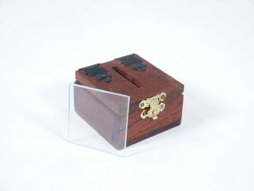 With this wooden box you will be able to have a solid coin (not supplied) pass through a square of glass within and exit the bottom. Includes illustrated instructions. Condition very good.