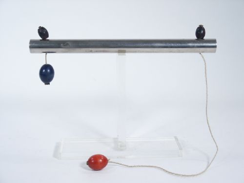 A simple version with metal pole being 11 1/8" in length and the wood beads are in an olive shape. Condition good.