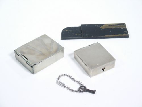 A classic effect where a spectator's borrowed coin is marked and caused to vanish. A ball of wool (not supplied) is shown and unwound by placing in a glass container or what have you. Getting to the end of the wool it is discovered to have had a small silver box within that is bound with rubberbands. The spectator is asked to remove the bands and it is found to contain a smaller locked box! The magician hands the spectator a key and asked to open the box which is done. The discovery is to the amazement to all the previously vanished marked coin within! Includes instructions. Condition inner lock box has patina inside lid, otherwise function is perfect, fine.