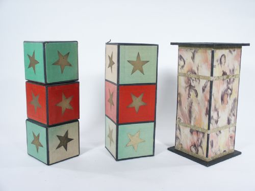 This stands 11 5/8" high with wood frame trim at top and bottom. This is original Conradi Horster from Germany. The red block vanishes from in between the green blocks and seen to have penetrated into a hat. What you have is a sleeve fake resembling three blocks with larger opening and this has a hold back gimmick and cover tube also has a flap that opens allowing for exit of block. No instructions. Condition very good.