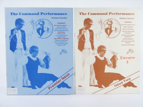 | The Command Performance Premier Issue, 1980, soft bound, 32 pages, illustrated. Contents: The Iceman Cometh, Corner Switch, This'll Flip You Out!, Switching Sandwiches, Card Cubes, Wiped Clean, Torn and Restored Cigarette #1, Signed Bill In Lightbulb, Isolated Prediction, Let's Hit The Bottle, Torn and Restored Cigarette #2. Condition private collection identifier label, very fine.