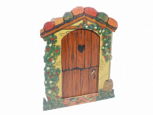 Made of wood and all hand painted, standing 11" high x width 9" x 3 1/2" deep. The door is slid up to show emptiness and slid closed. At the will of the magician the door is slid up once more to reveal whatever will sit upon the shelf not seen that measures 3" deep x 4 1/2" wide. Condition unseen shelf has a small 1 1/4" area underneath that is grain separating not affecting working, otherwise fine. This is so nicely decorated as few pieces are.