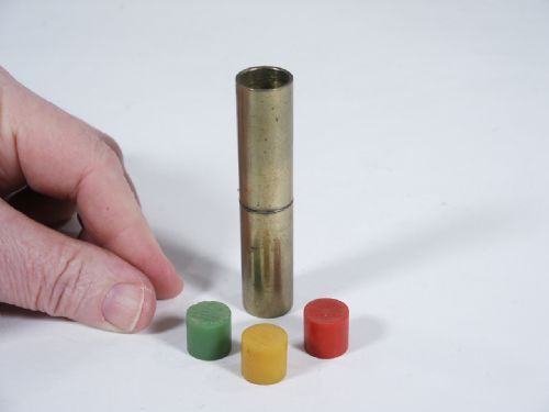 A much smaller version with a brass tube for the rearranging blocks effect. Tube is 3" in size and has a block hold back that is controlled by magician. A scarce and fine condition effect.