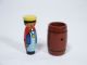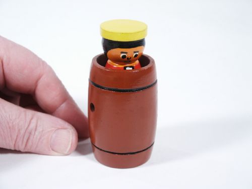 This beautifully painted piece is made of wood and measures 2 3/4" high and represents a Princess that is placed in a barrel and a ribbon placed through yet she escapes! Includes original German language instructions along with English translation. Also included are illustrated instructions for the method of working this type of effect. Does not include ribbon or small wand to push ribbon in. Condition First Rate Beautiful.