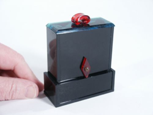 As far Ed Massey items go this one is one of the most elusive to find. This elegant looking case of plex stands 3 5/8" high with a width of 2 3/4" and depth of 1 3/8" having a lid on top that when removed shows four openings. The magician is able to have a spectator place four different brands of cigarettes within or any number and yet divine the contents and positions. This could also be done with small color crayons if cigarettes not suitable. Includes copy of original ad. The secret to the working will be given to the purchaser. I waited for years before being able to acquire one for myself. Condition very fine.