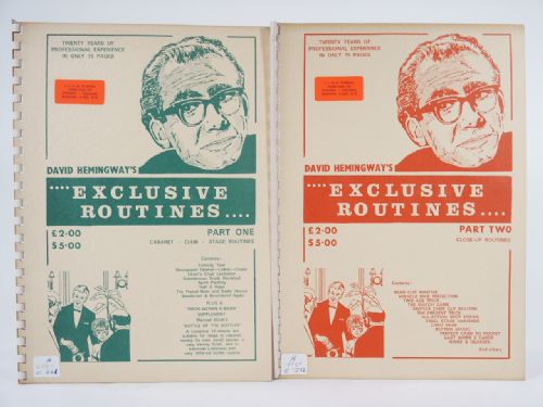 David Hemingway's Exclusive Routines Part One, Cabaret-Club-Stage Routines, soft bound, 31 pages, illustrated. Contents: Comedy Tear, Newspaper Opener-Linker-Closer, Elliott's Chair Levitation, Substitution Trunk Revisited, Spirit Painting, Half A Rope, The Pound Note and Radio Waves, Bewitched and Bewildered Again, Plus a Book Within A Book Supplement: Michael Elliott's Battle Of The Bottles: A Complete 15 minute act suitable for stage or cabaret, having its own novel opener, a very strong finish, and in between a hilarious and very different bottle routine. Condition private collection identifier number, very fine.