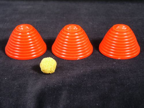 Instead of the usual walnut covers this has the advantage of easy grip covers that are 1 3/4" diameter and 1 1/8" high and work unbelievably well on a close up mat to steal or add in the sponge ball. This includes 3 shell game instructions. Condition First Rate.