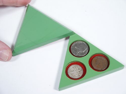 A triangle shape is shown and top half removed giving a view to interior showing three well openings lined with red felt. Within each is shown a coin being a dime, penny and nickel. The unit allows that coins may change value due to the magnet principle built in to the top. Two shell coins that are shimmed are included one being a Wheat Penny and the other a Nickel from 1948. No instructions and wood unit is very well made even down to a nice bevel made to the top piece. Regular dimes not supplied. Condition First Rate.